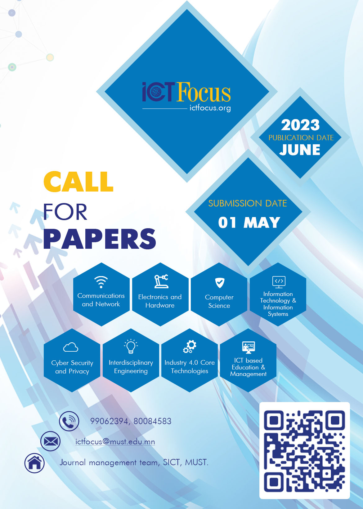ШУТИС-ийн МХТС-иас эрхлэн гаргаж байгаа “ICTFocus” олон улсын эрдэм шинжилгээний сэтгүүлийн II дугаарт өгүүлэл хүлээн авч байна. Энэ удаагийн хэвлэлийг өмнөх дугаарын адил мөнгөн урамшуулалтай байхаар төлөвлөж байгаа тул та бүхнийг өгүүллээ хэвлүүлэхийг урьж байна.