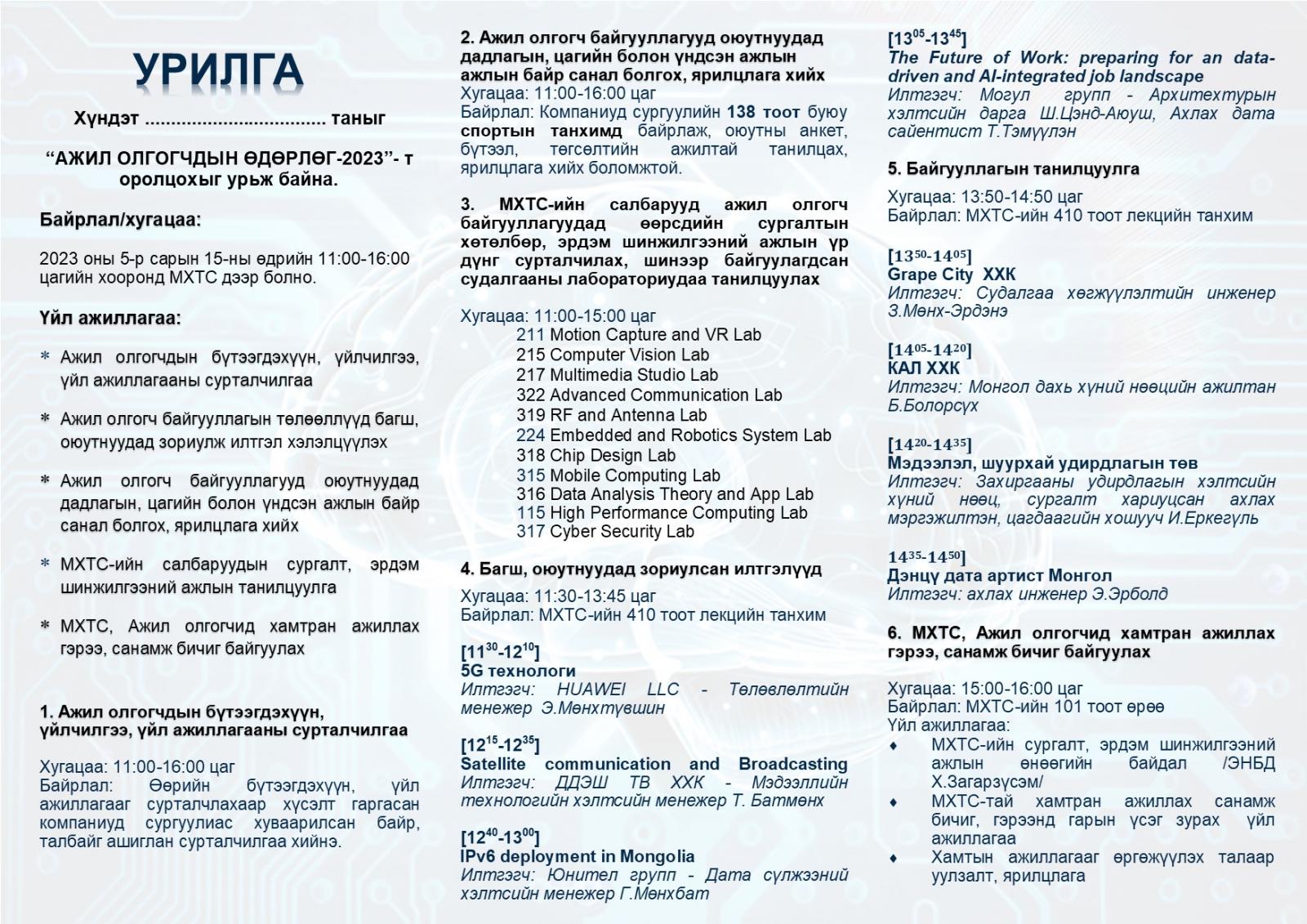 МХТС ба ажил олгогч байгууллага хоорондын хамтын ажиллагааг өргөжүүлэх, төгсөгчдийг ажлын байранд зуучлах зорилгоор ажил олгогчдын өдөрлөгийг 2023 оны 5 дугаар сарын 15-ны өдөр ШУТИС-ийн МХТС-ийн хичээлийн байранд зохион байгуулах гэж байна.